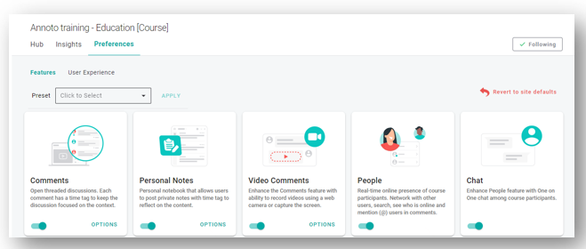 For example, you can set default preferences for Annoto features that will be overlaid across your course video content, and then update specific videos with different desired features.&#x20;