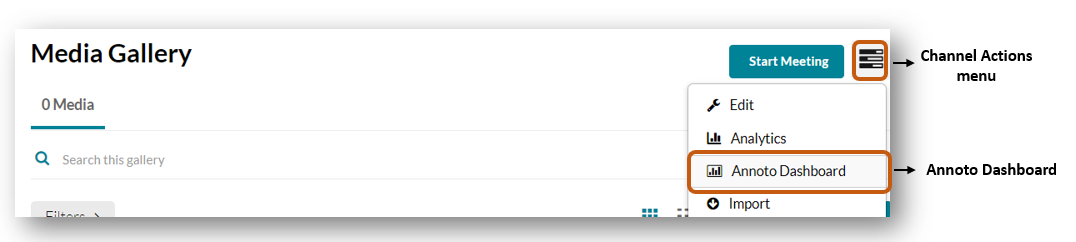 <figure><img src="https://566050748-files.gitbook.io/~/files/v0/b/gitbook-x-prod.appspot.com/o/spaces%2F-LyZZ-Rd8ZeUw4DKgY2O%2Fuploads%2FppKnXlW11SJP5BvDJ2r3%2Fimage.png?alt=media&#x26;token=219a9878-2176-41db-a01c-70ecb1df8e4f" alt=""><figcaption><p>Illustration: Channel Actions menu. Annoto Dashboard option</p></figcaption></figure>