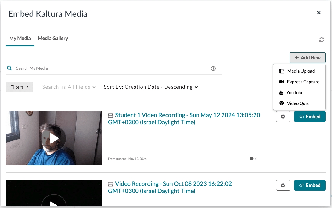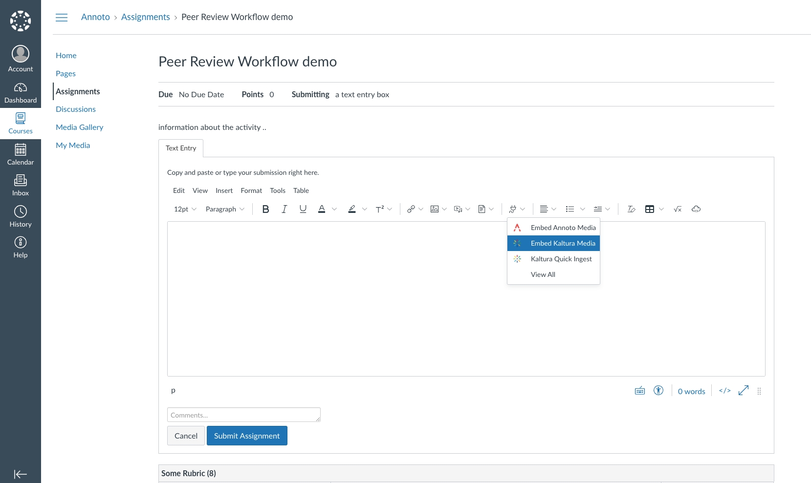 14. Click to "Start Assignment" and then click on "Embed Kaltura Media"
