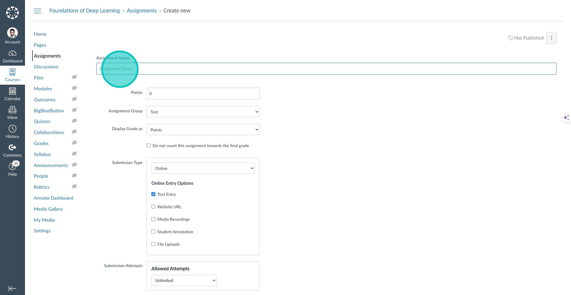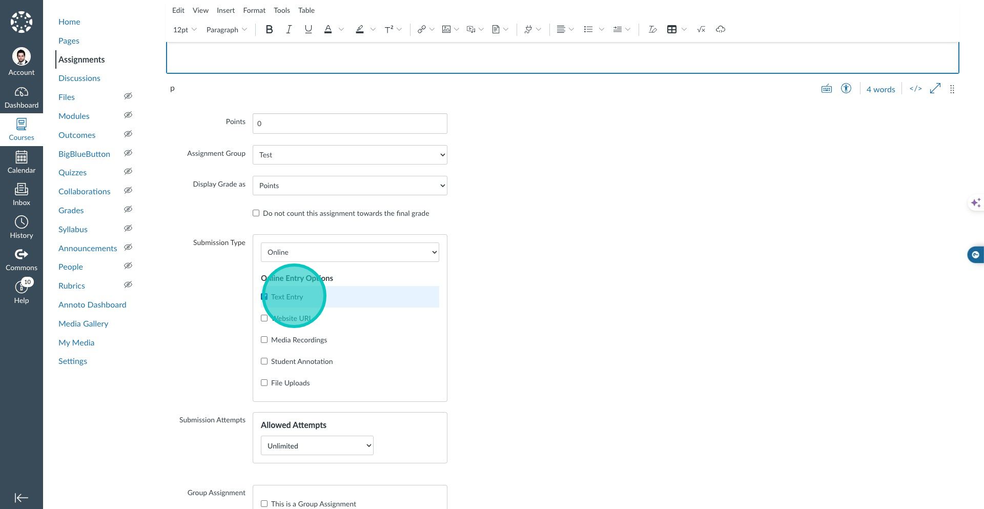 5. Select the Submission Type as "Online" and also check the "Text Box" for the Online Entry Option.