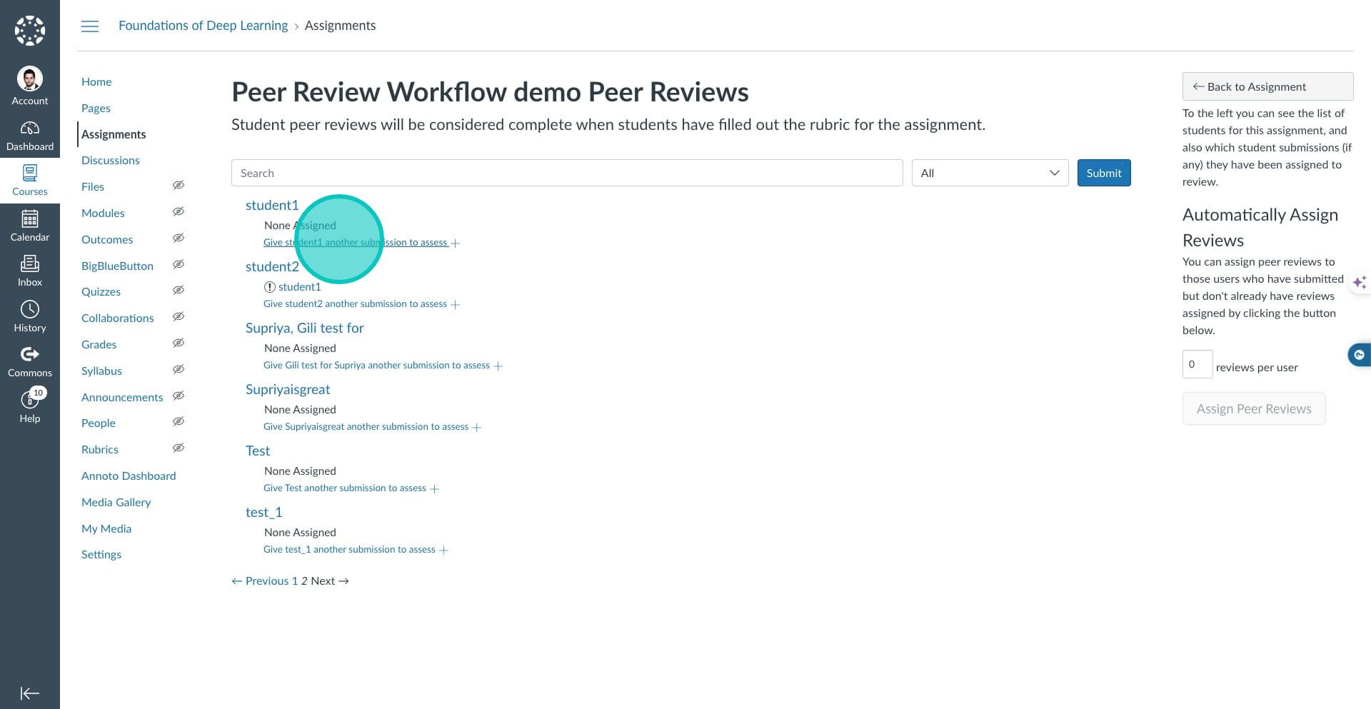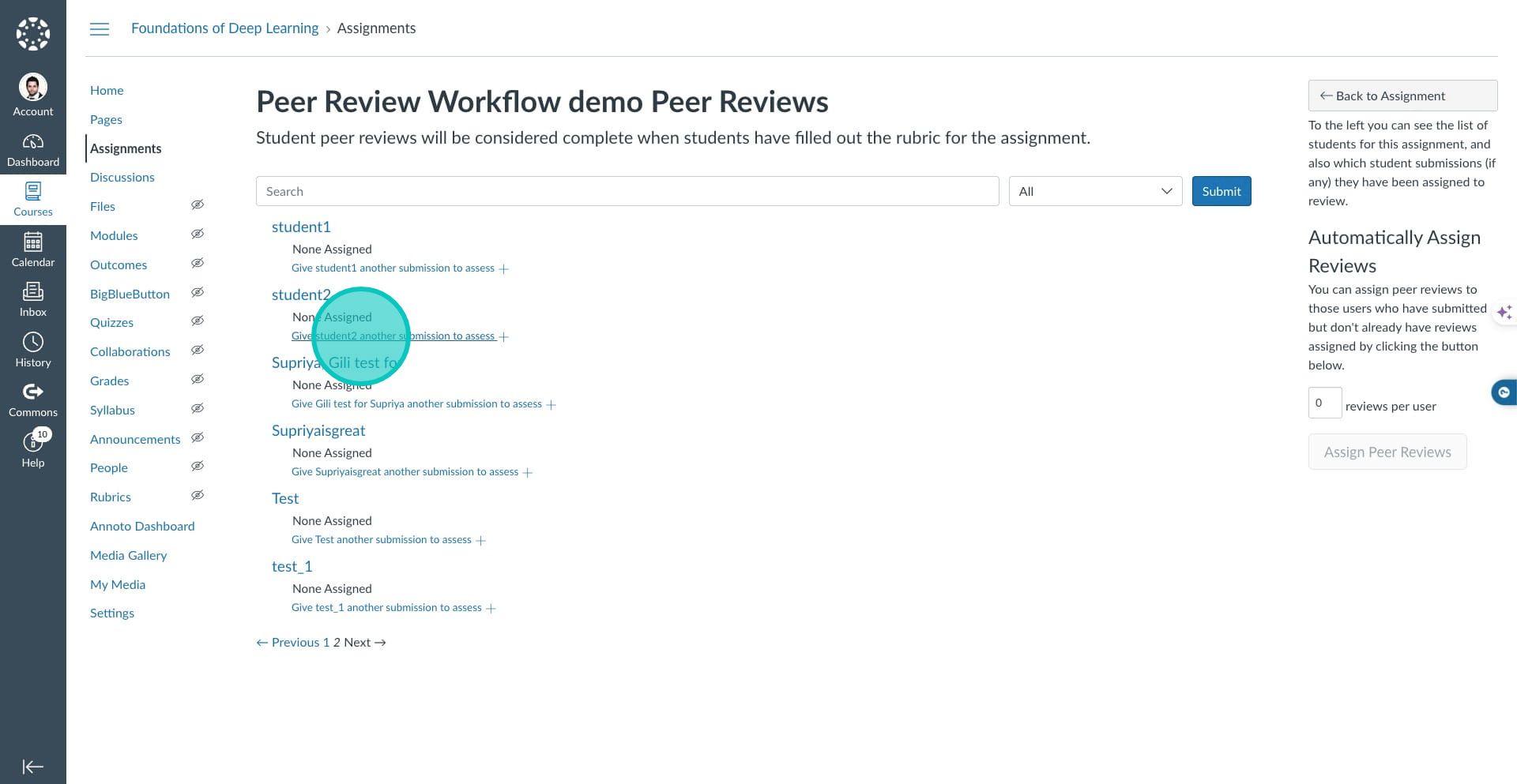 11. Click on the option "Give student1 another submission to assess" and select student 2.