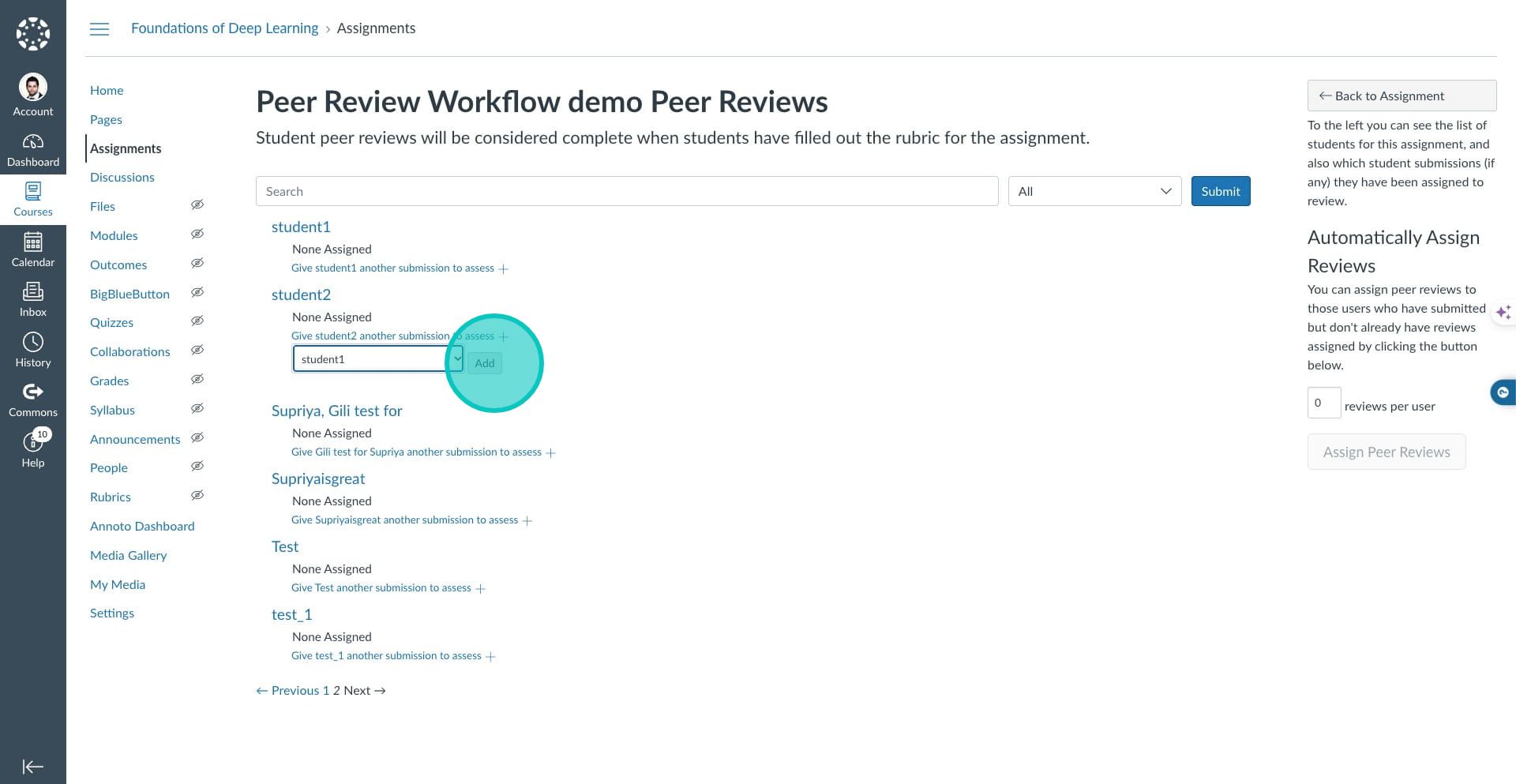 10. Click on the option "Give student2 another submission to assess" and select student 1.